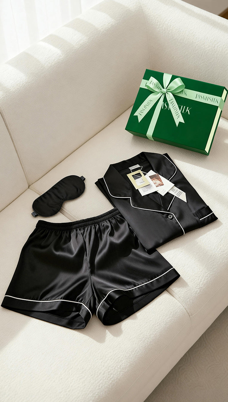 Experience effortless luxury with the Jasmisilk Short-Sleeve Silk Pajama & Eye Mask Gift Set. Crafted from soft, breathable 100% Mulberry Silk, this elegant sleepwear ensemble features a smooth short-sleeve top, relaxed-fit silk shorts, and a matching silk eye mask—designed to keep you cool, comfortable, and beautifully relaxed through warm nights or cozy evenings indoors. Thoughtfully arranged in a premium Jasmisilk gift box, each set delivers an indulgent unboxing experience from the very first touch, making it a meaningful gift for Christmas, birthdays, or intimate special moments.