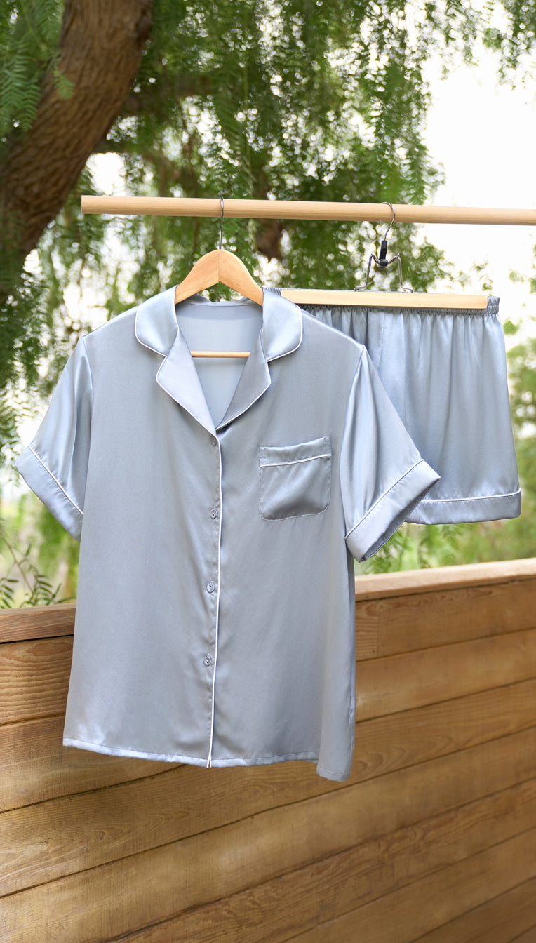 Luxury Silk Short-Sleeve Pajama Set & Eye Mask – 100% Mulberry Silk Gift for Her | Haze Blue