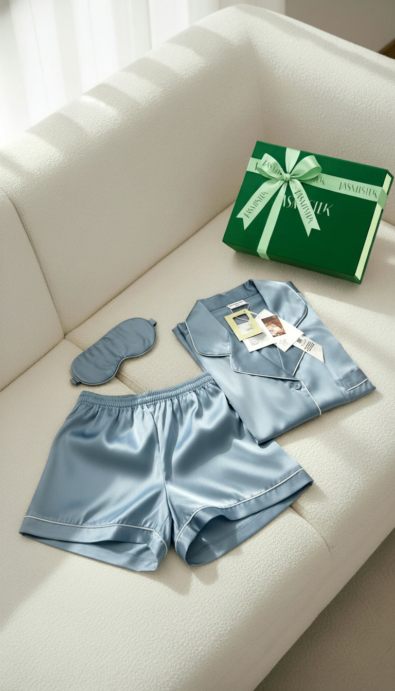 Experience effortless luxury with the Jasmisilk Short-Sleeve Silk Pajama & Eye Mask Gift Set. Crafted from soft, breathable 100% Mulberry Silk, this elegant sleepwear ensemble features a smooth short-sleeve top, relaxed-fit silk shorts, and a matching silk eye mask—designed to keep you cool, comfortable, and beautifully relaxed through warm nights or cozy evenings indoors. Thoughtfully arranged in a premium Jasmisilk gift box, each set delivers an indulgent unboxing experience from the very first touch, making it a meaningful gift for Christmas, birthdays, or intimate special moments.