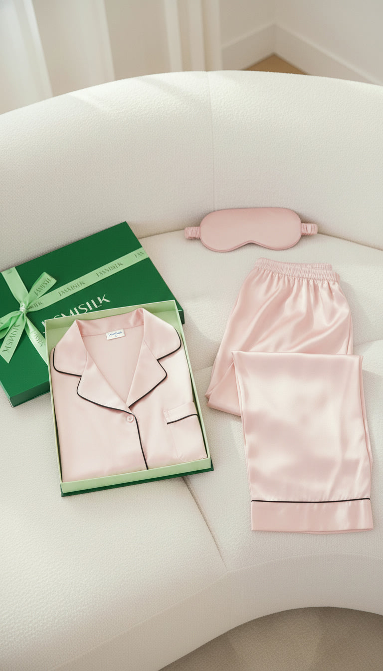 Experience elevated comfort with the Jasmisilk Long-Sleeve Silk Pajama & Eye Mask Gift Set. Crafted from soft, breathable 100% Mulberry Silk, this luxurious ensemble includes a smooth long-sleeve top, relaxed-fit silk pants, and a matching silk eye mask—designed to keep you warm, comfortable, and beautifully relaxed through cooler nights or cozy evenings at home. Thoughtfully arranged in a premium Jasmisilk gift box, each set offers an indulgent unboxing experience from the very first touch, making it an elegant gift for Christmas, birthdays, or intimate special moments.