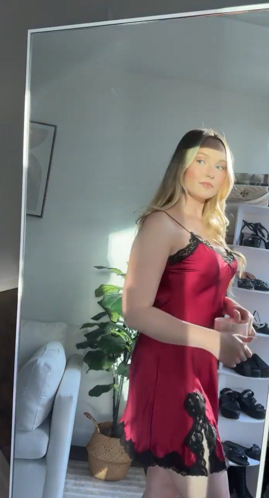 Pure Silk Lace Trim Chemise Nightgown with Split Hem In Burgundy