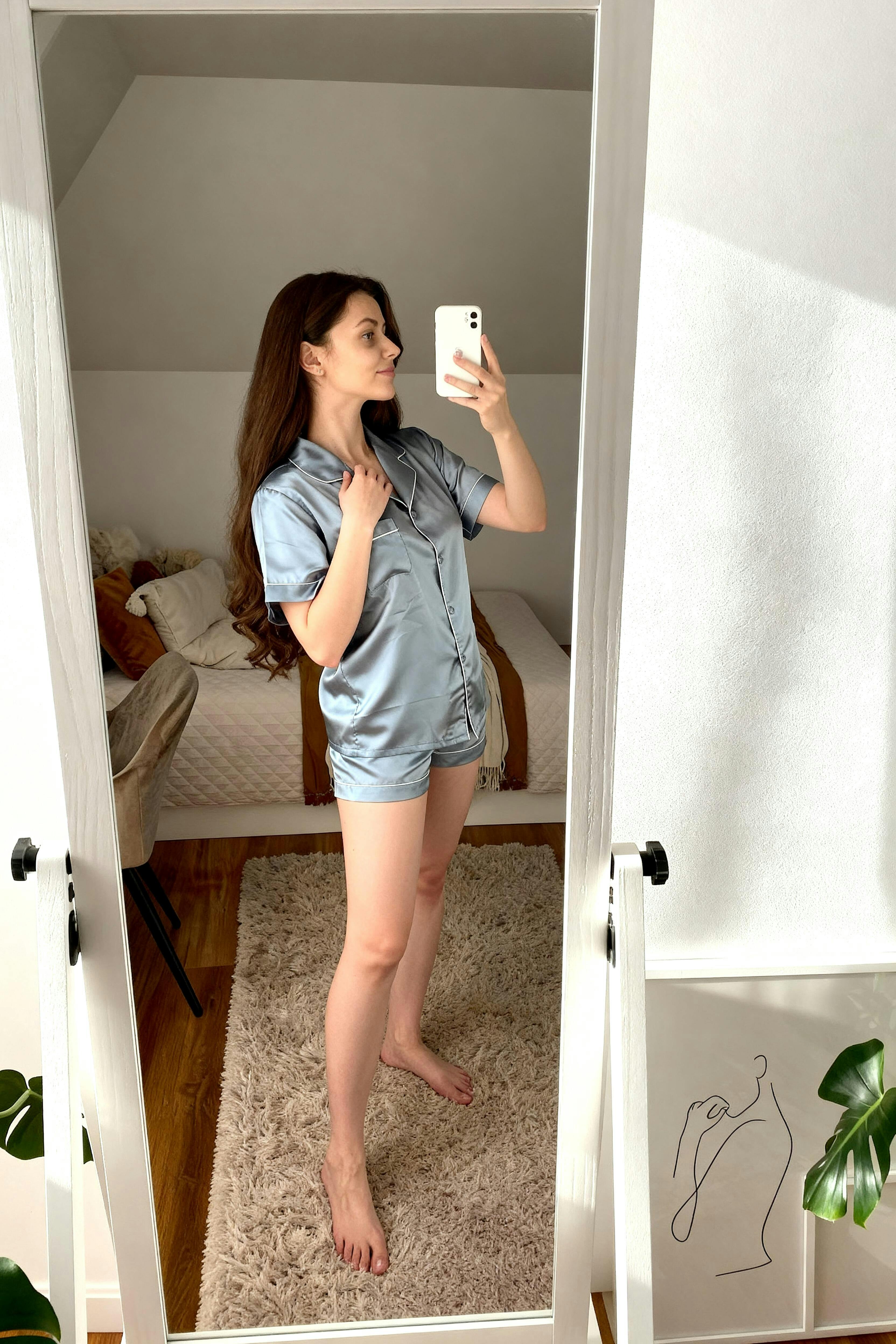 I recently purchased, and I must say, I'm thoroughly impressed! The set is everything I had hoped for and more.Quality and Construction: The silk fabric is incredibly soft and smooth to the touch. The short sleeves and button-down design are a lovely touch. The construction is sturdy and well-made, with no loose threads or seams to worry about.Fit: I was a bit concerned about the sizing, but the large fits me like a glove. The top is flowy and comfortable, with a relaxed fit that doesn't feel too tight or constricting. The pants are equally as comfortable, with an elastic waistband that provides a secure fit without being too tight.Comfort: Ah, the comfort! This set is designed for sleeping, and it truly delivers. The silk fabric is breathable and gentle on my skin, making it perfect for sensitive skin types. I've worn it to bed every night since I got it, and I've woken up feeling refreshed and cozy.