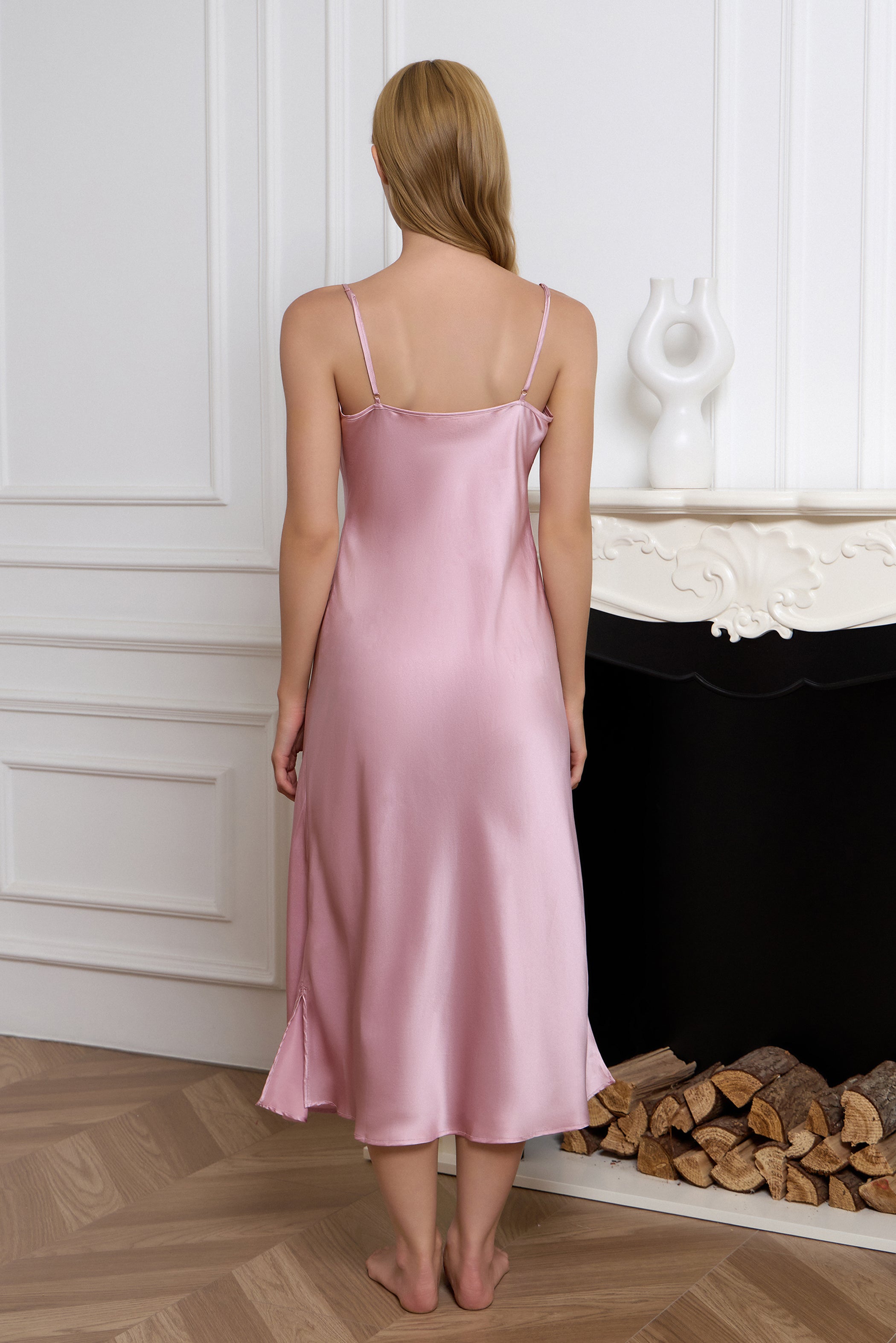 Silk V-Neck Lace Trim Slip Nightgown – Pale Pink Midi Dress