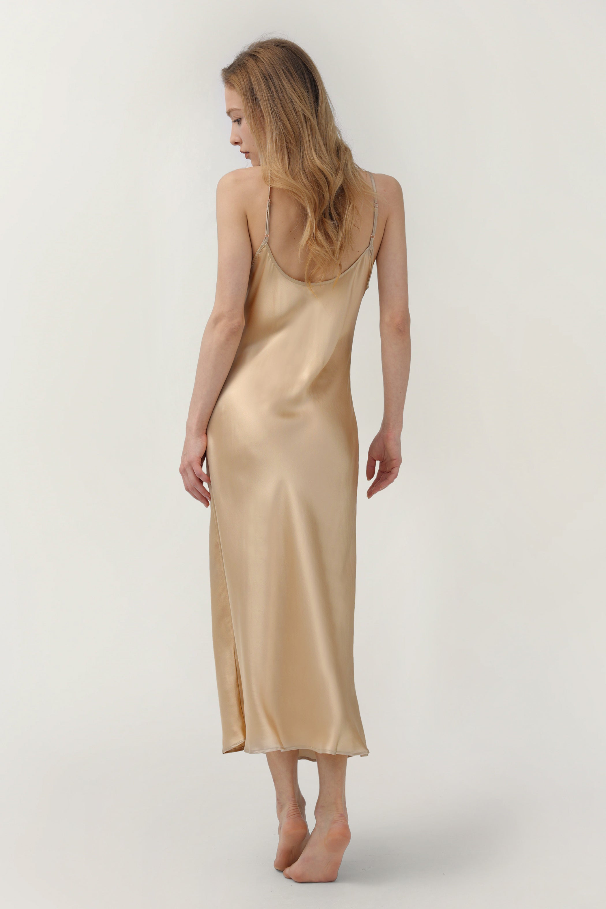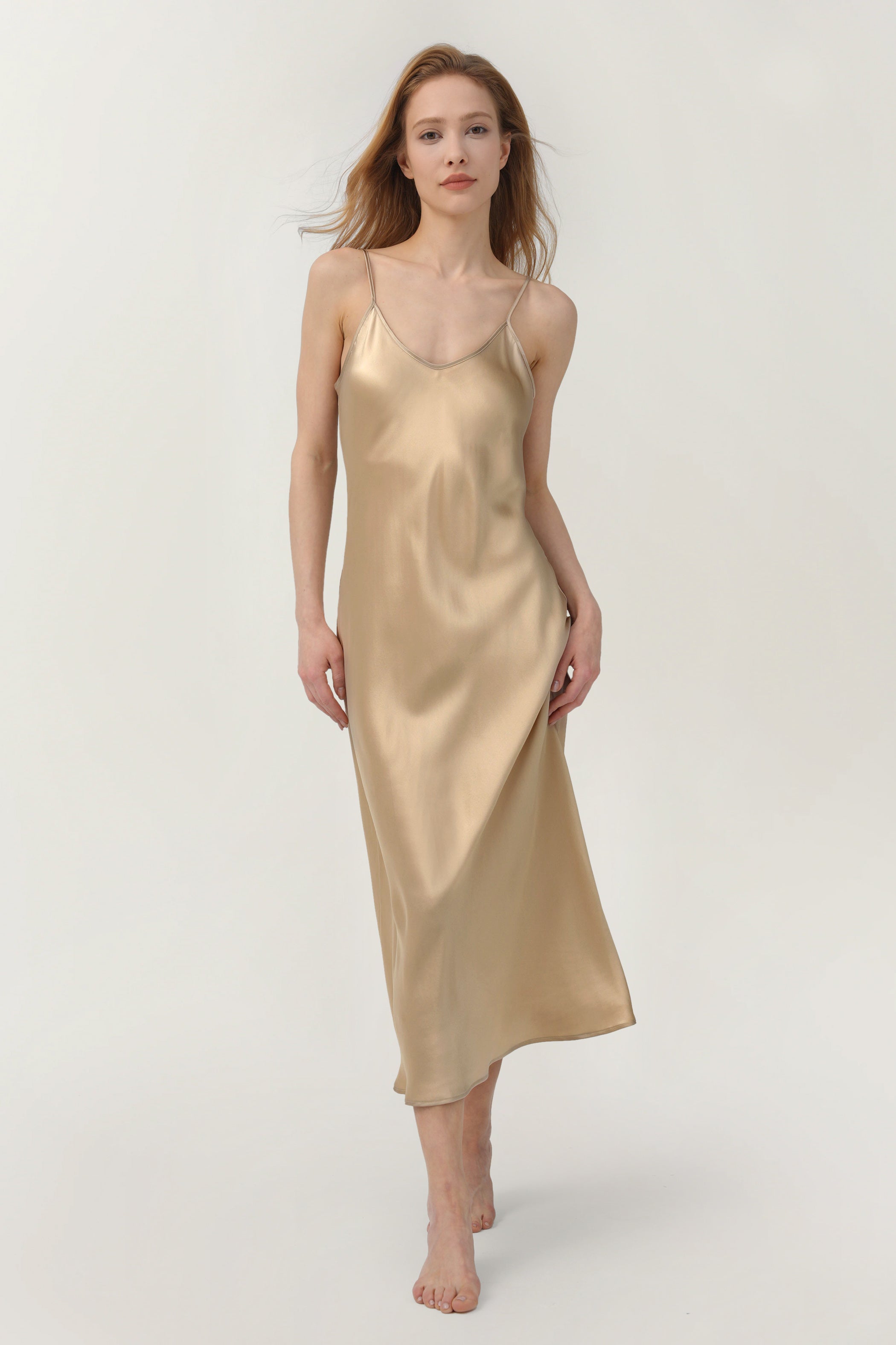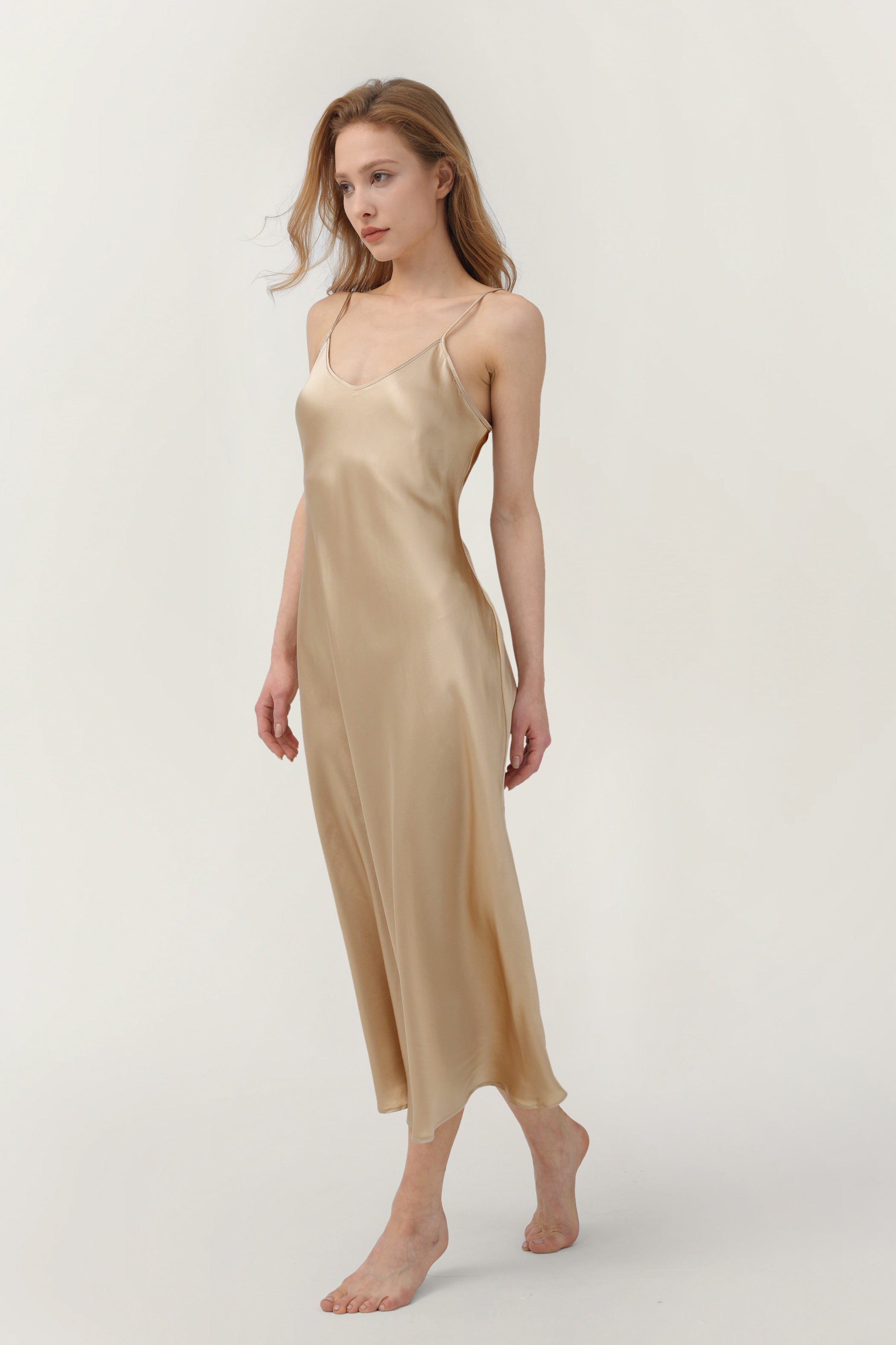 fake-image Pure Silk Spaghetti Strap Long Dress In Champagne – Jasmisilk