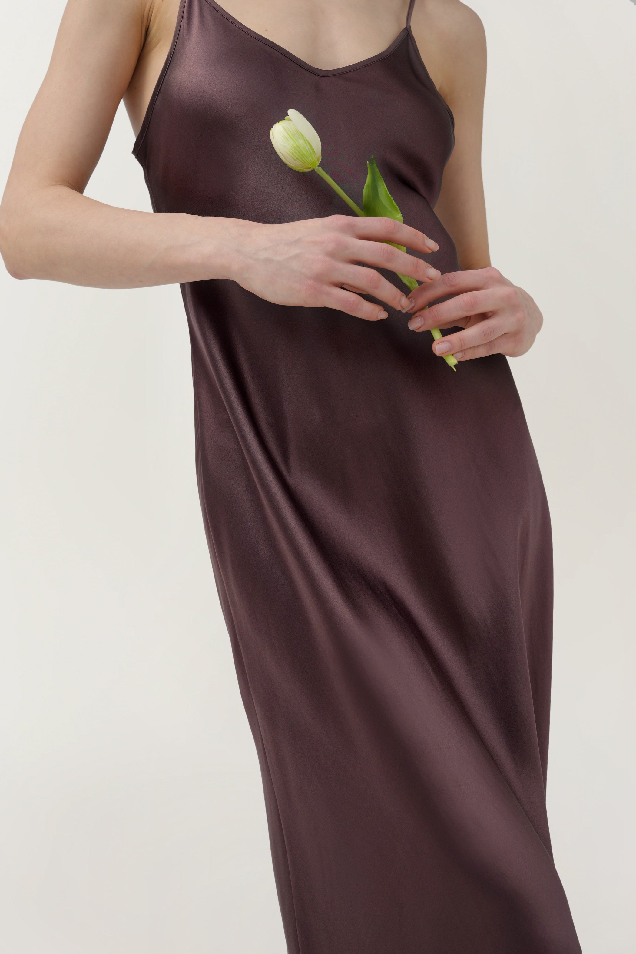 Pure Silk Spaghetti Strap Long Dress In Coffee