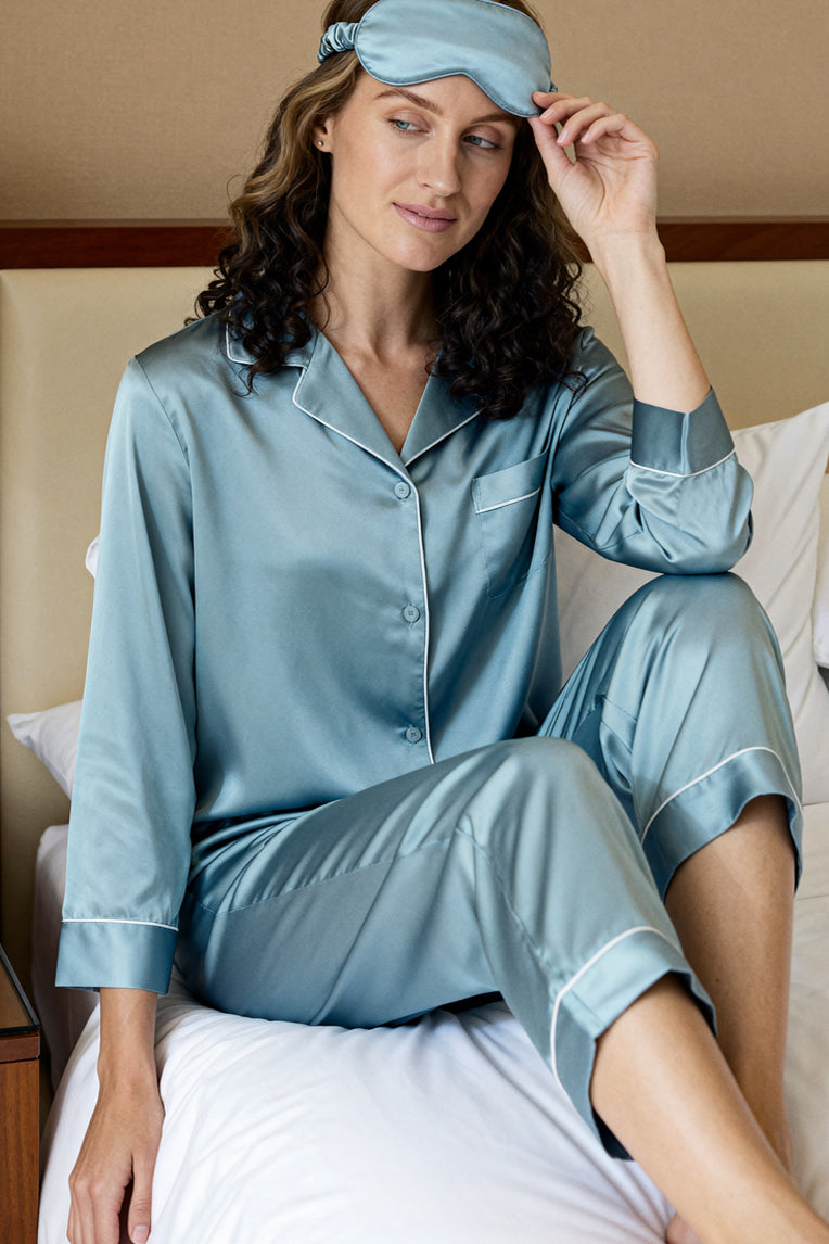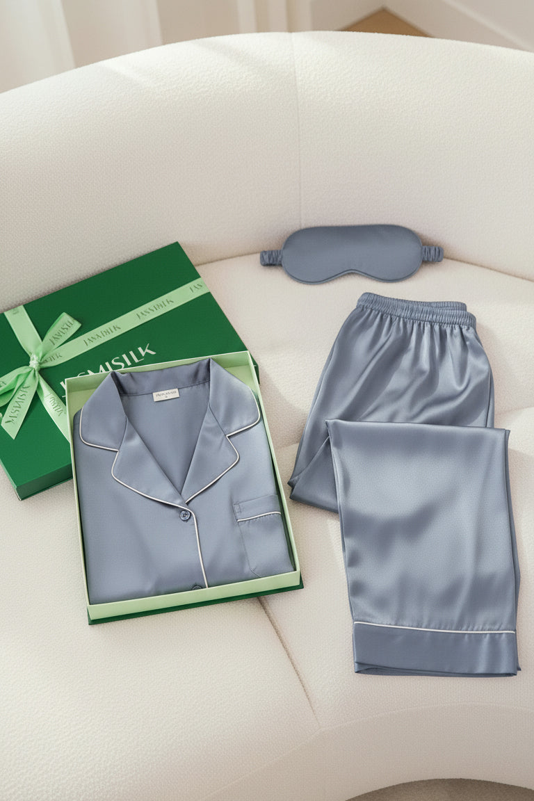 Silk Long-Sleeve Pajama Set & Eye Mask – 100% Mulberry Silk Gift Set for Women | Haze Blue