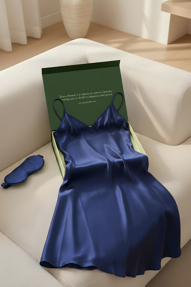 100% Mulberry Silk Short Slip Dress & Eye Mask – Luxury Gift for Her | Navy Blue