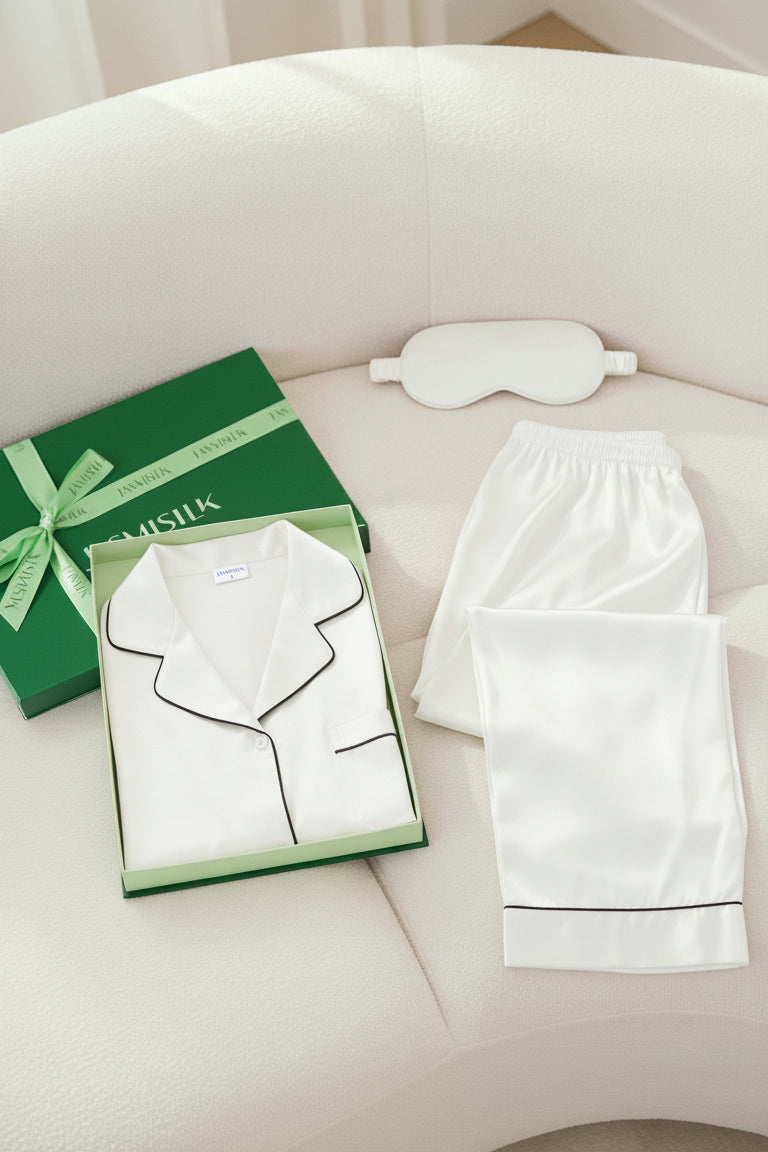 Silk Long-Sleeve Pajama Set & Eye Mask – 100% Mulberry Silk Gift Set for Women | White