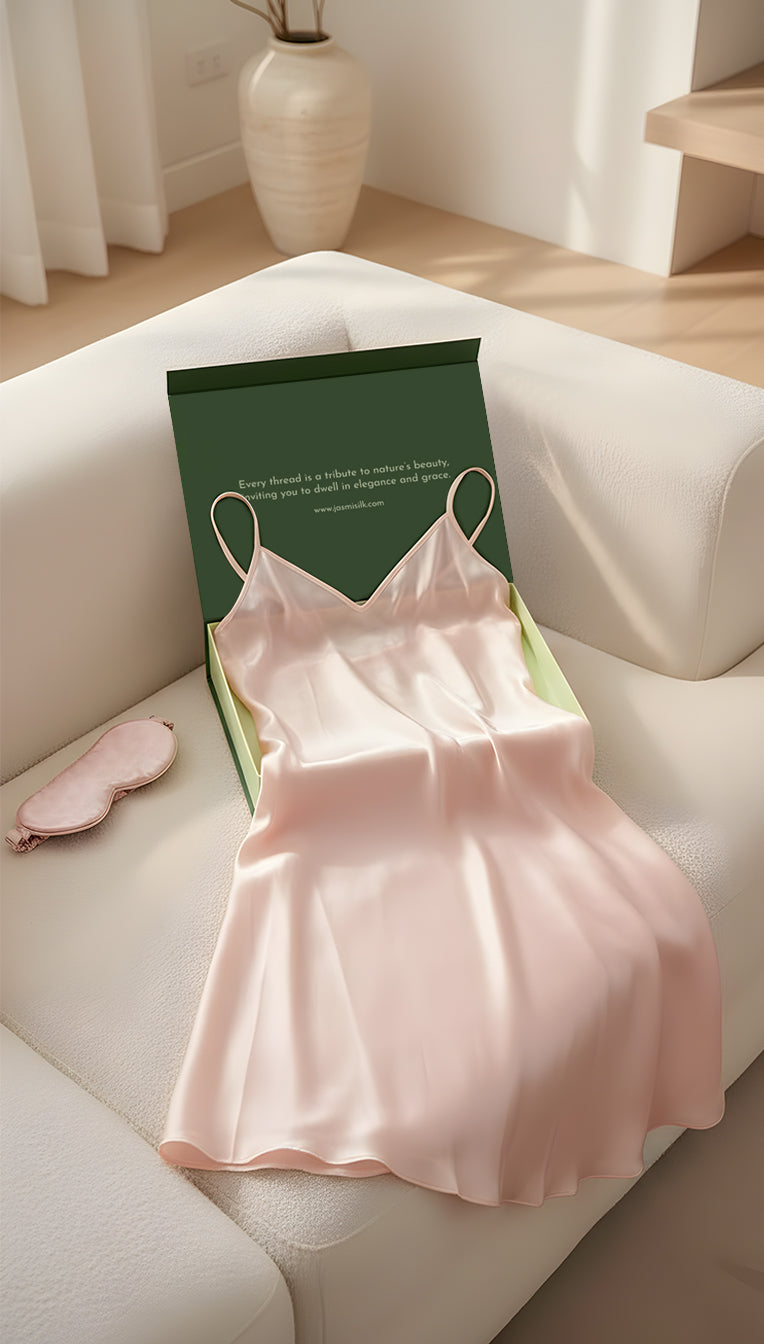 Experience effortless elegance with the Jasmisilk 100% Mulberry Silk Short Slip Dress & Eye Mask Gift Set. Designed with a soft, fluid drape that flatters every silhouette, this luxurious slip dress is paired with a matching silk eye mask to create the perfect blend of comfort and beauty. Light, breathable, and irresistibly smooth, each piece is crafted to keep you cool, relaxed, and indulged through every evening. Thoughtfully presented in a premium Jasmisilk gift box, this set offers a refined unboxing experience that makes it an unforgettable gift for Christmas, birthdays, or intimate special moments.