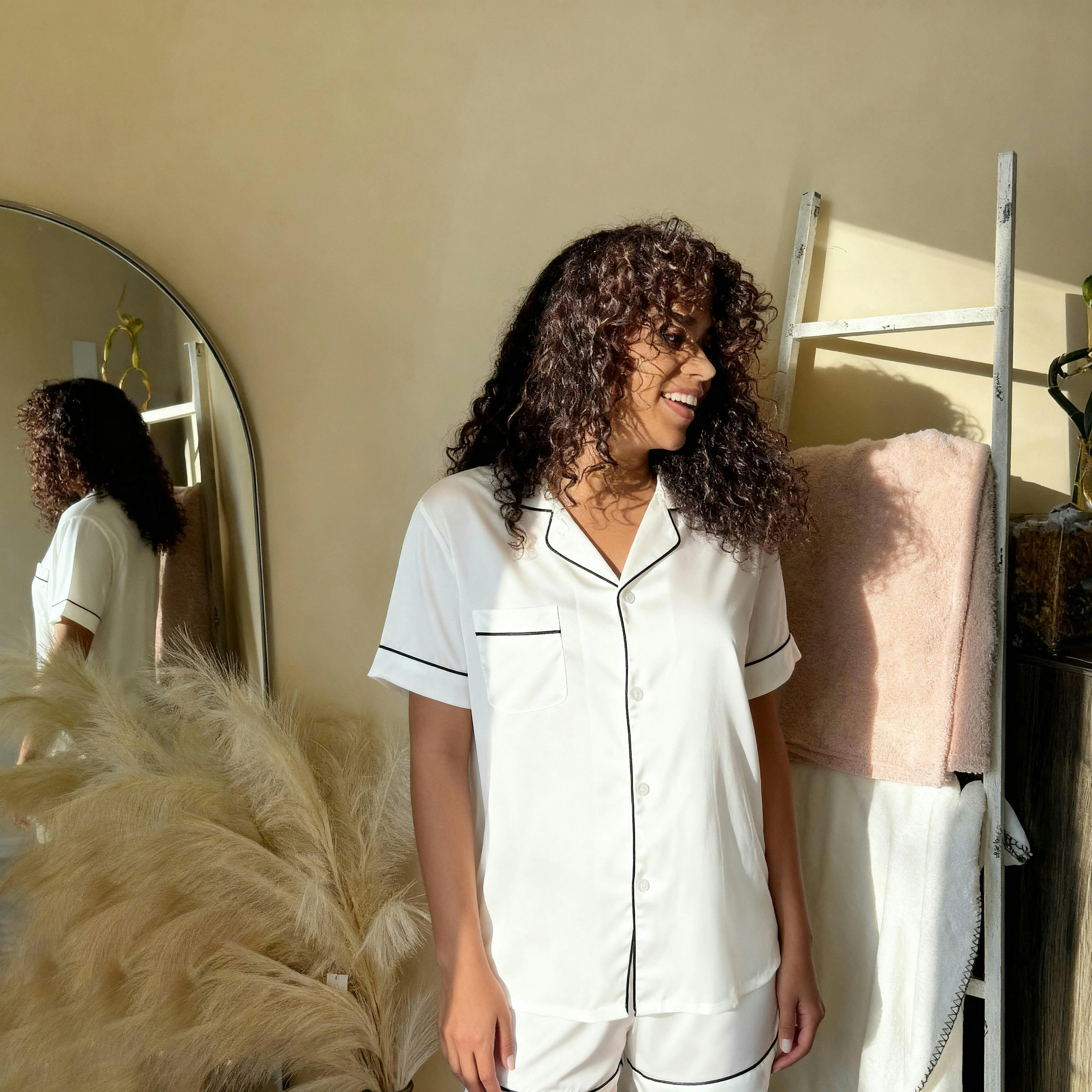 Women’s Short-Sleeve & Shorts Silk Pajama Set In White