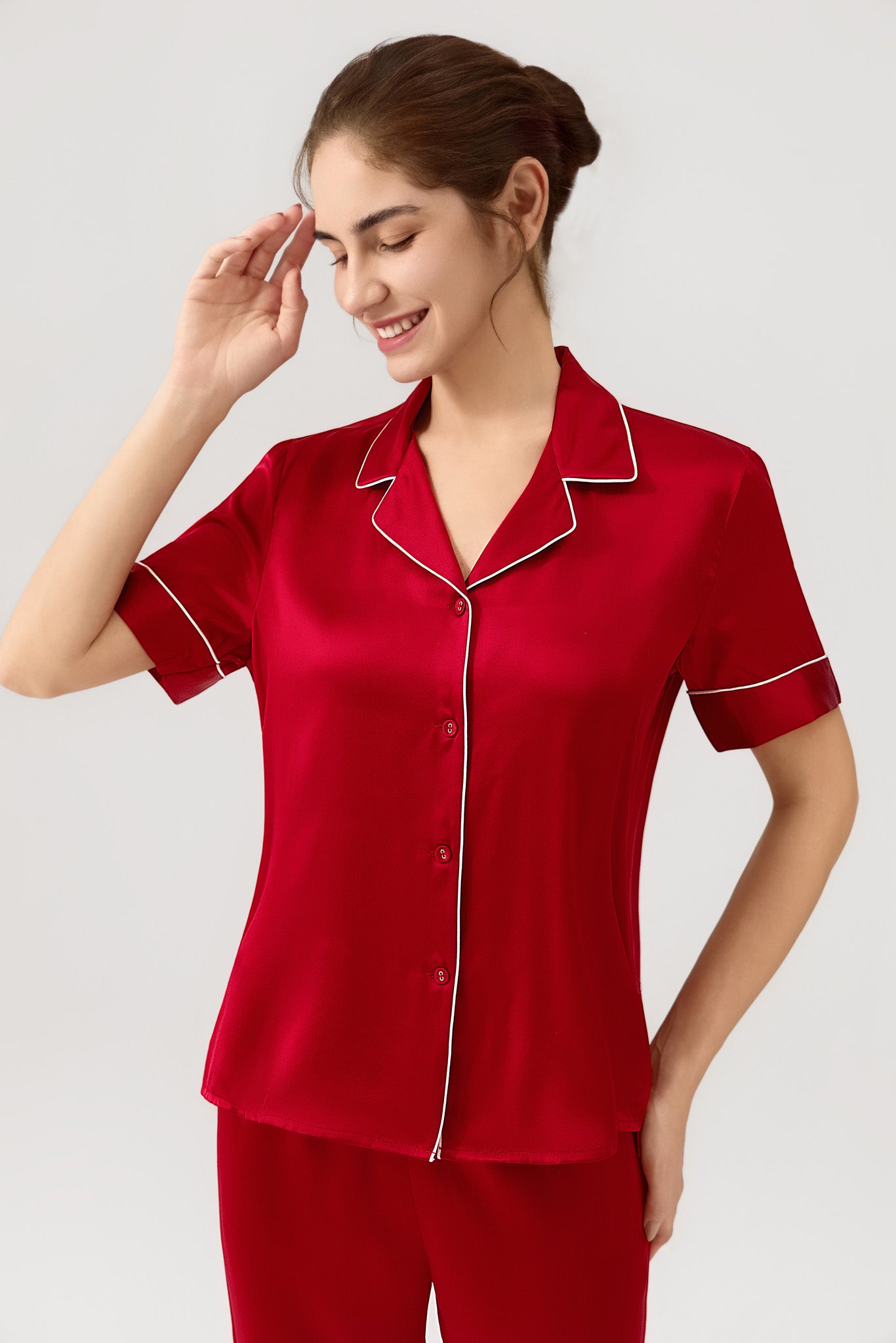 fake-image Women's Pure Silk Pajama Set - Short Sleeve Top & Long Pants In Burgun – Jasmisilk